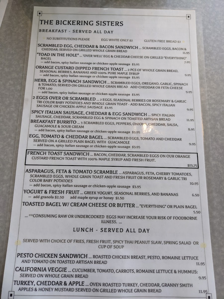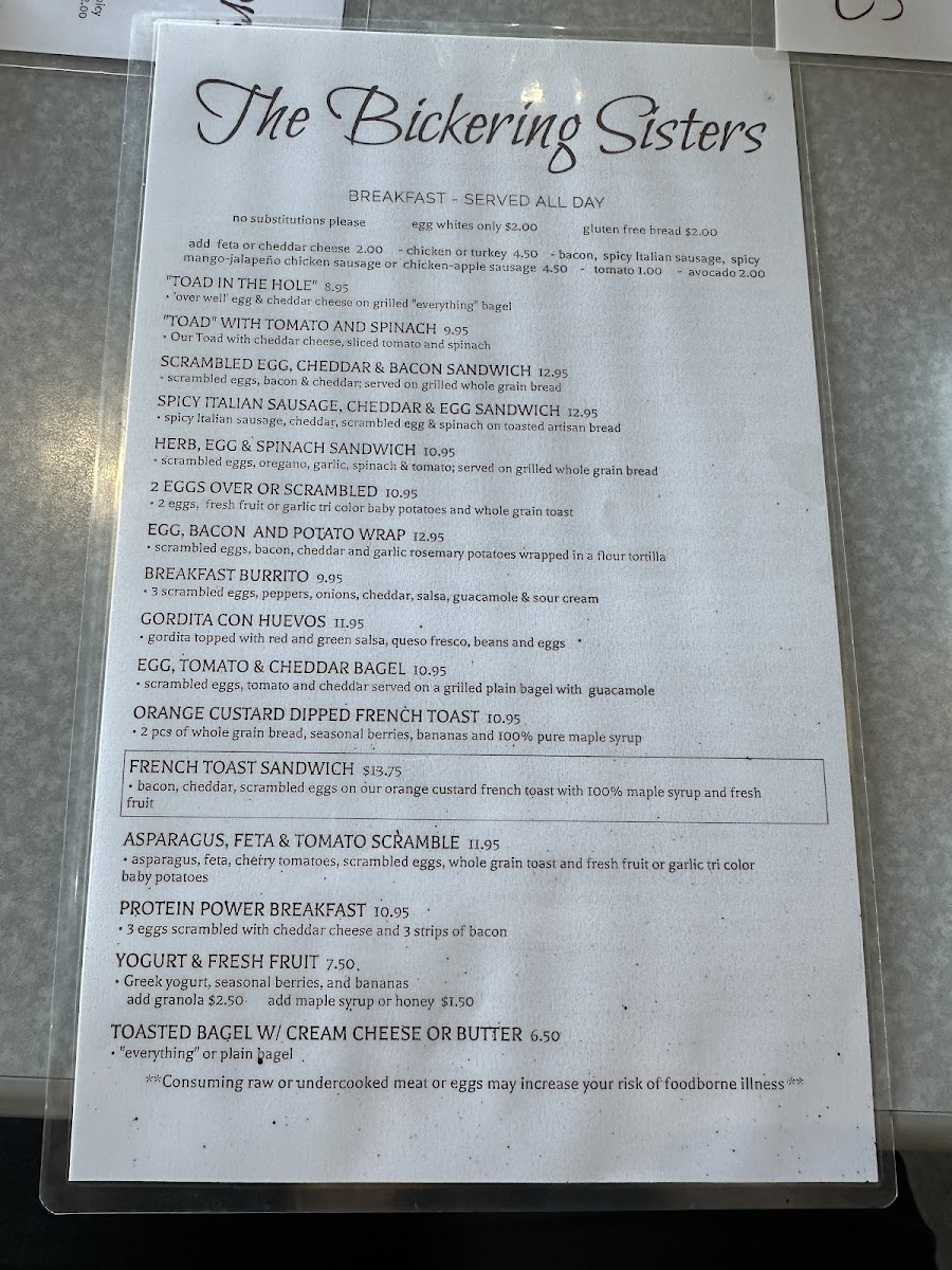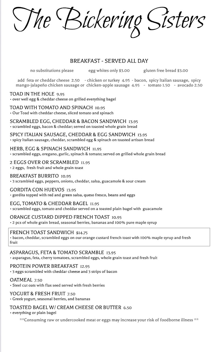 Bacon, cheddar, scrambled eggs on our orange custard French toast with 100% maple syrup and fresh fruit